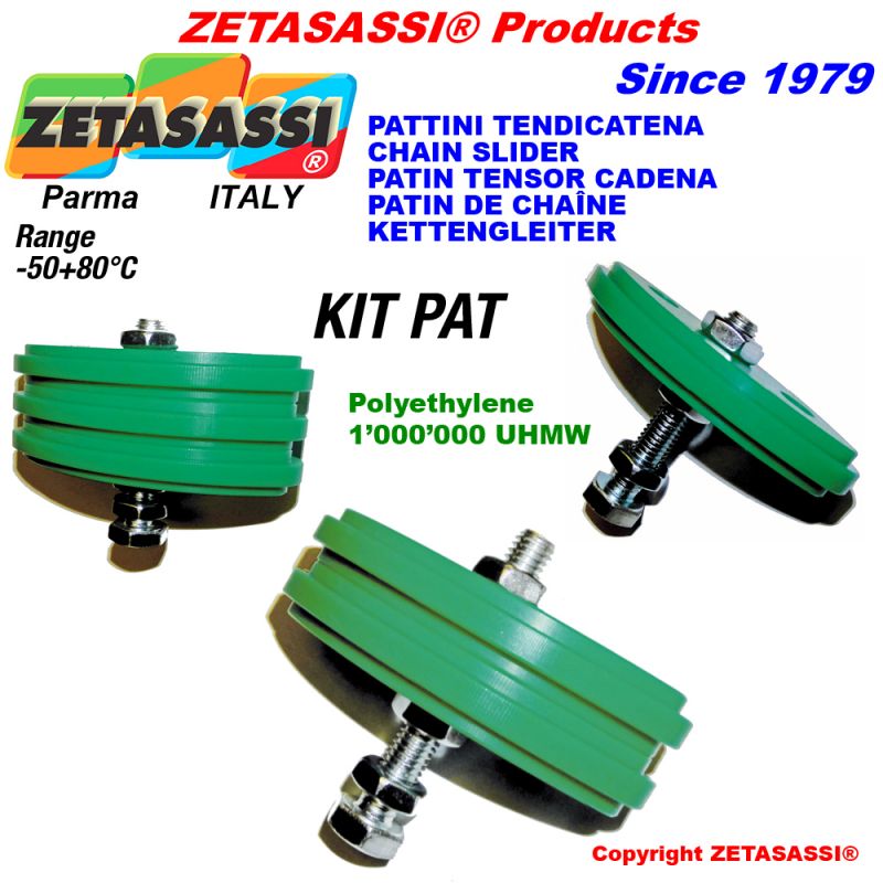 | -- | ZEKPAT38B3 | Kit patin de cadena set con dos lados utilizables tipo KPAT ZETASASSI® en polietileno 1000, con tornillo y tuerca, para cadena 06B3 3/8"x7\32" triple (Made in Italy) | -- | 17,36 € | 0 | Consultar |