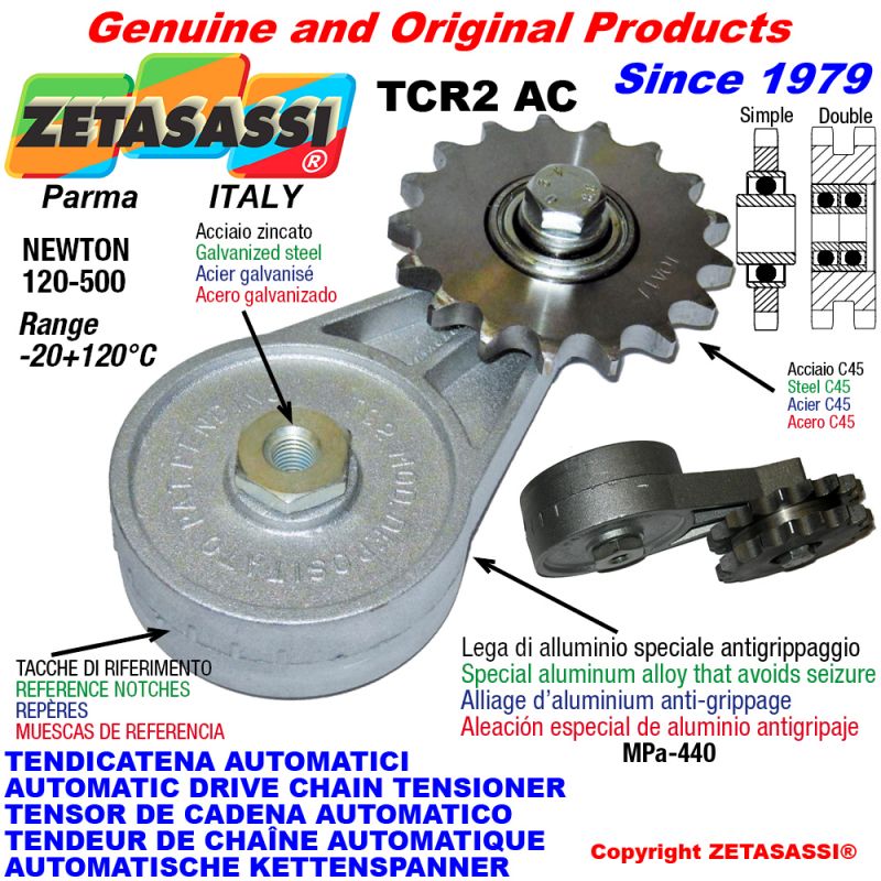 | -- | ZETCR2AC34D | Tensor de cadena rotativo TCR2 ZETASASSI® equipado de piñon tensor con rodamientos para la cadena doble 12B2 3\4"x7\16" 15 dientes de acero C45 Newton 120:500 (Made in Italy) | -- | 49,70 € | 0 | Consult |