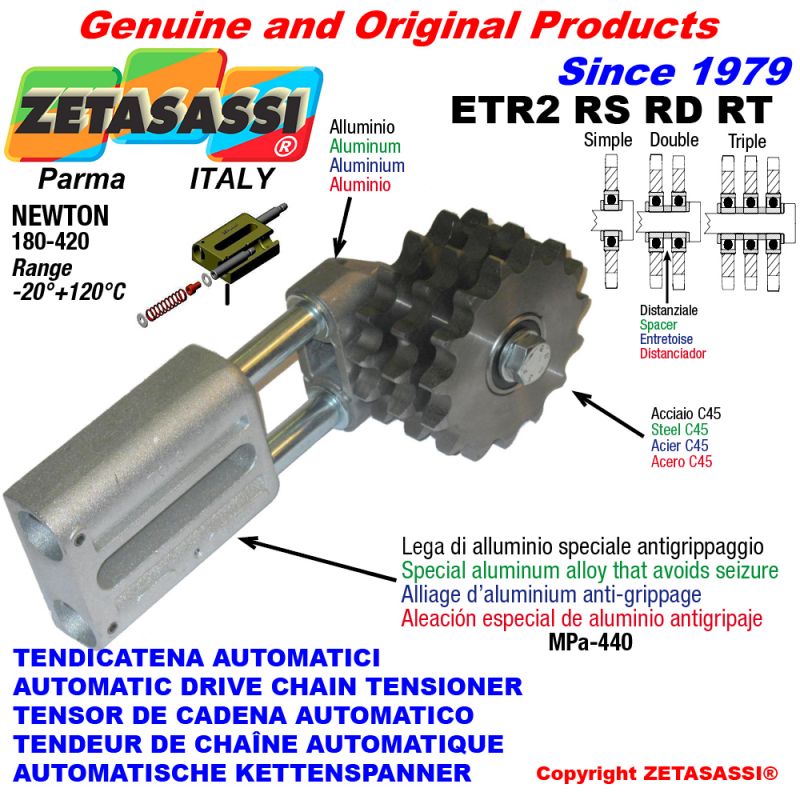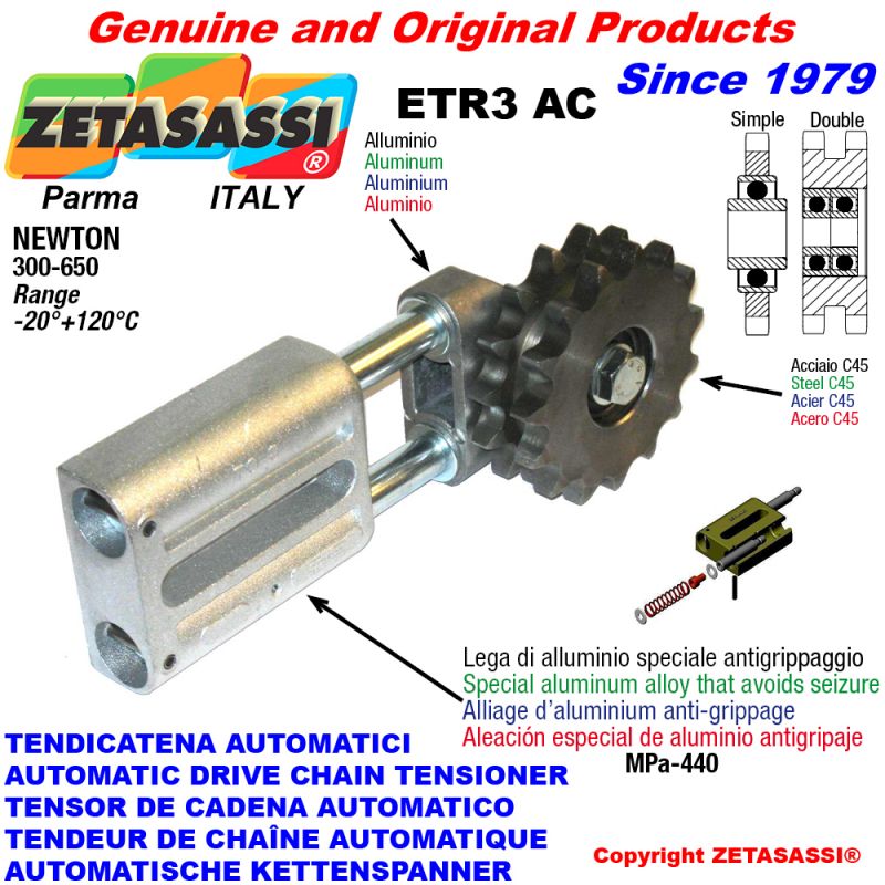 | -- | ZEETR3AC12D | Tensor de cadena lineal ZETASASSI® tipo ETR3 equipado de piñon tensor con rodamientos para la cadena doble 08B2 1\2"x5\16" 16 dientes de acero C45 Newton 300:650 (Made in Italy) | -- | 53,90 € | 0 | Consultar |